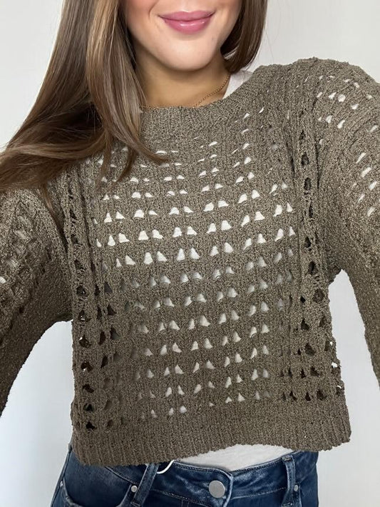 Dark Olive Long Flared Sleeve Open-Weave Sweater