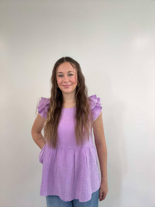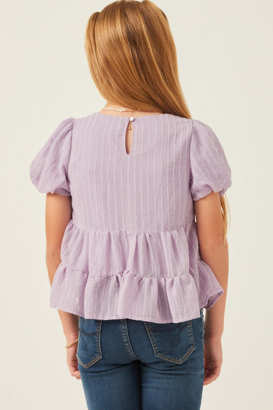 Girls Lavender Textured Stripe Puff Sleeve Tiered Top (Sizes S-XL)