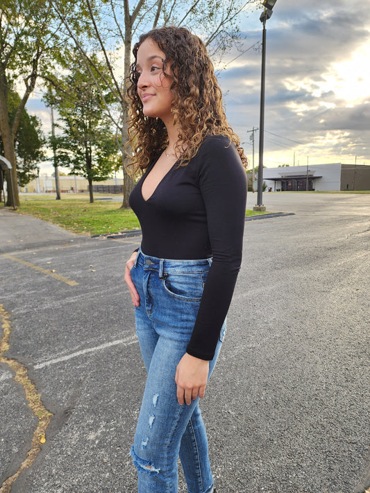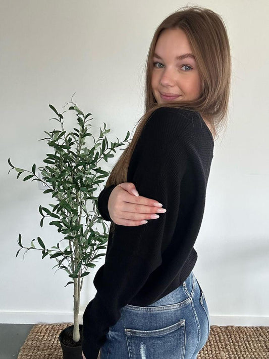Black Soft Elbow Sleeve Mixed Texture V-Neck Dolman Sweater