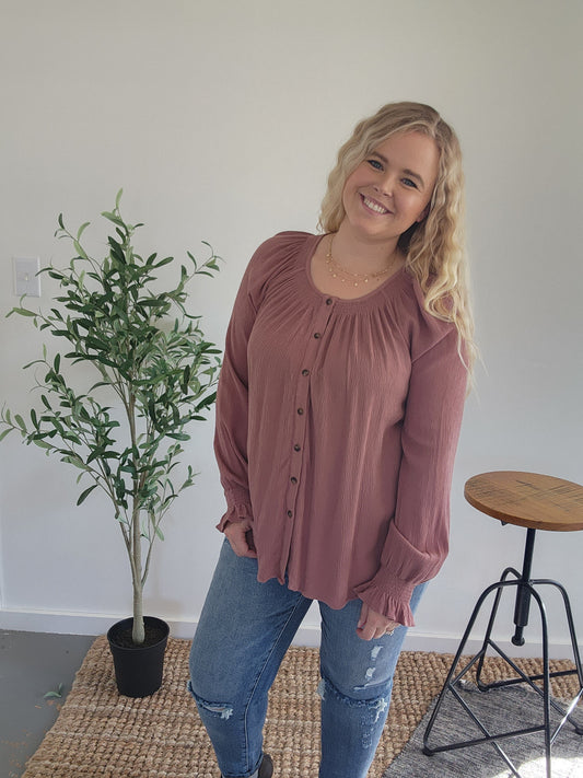 Mauve Crinkle Button Down Long Sleeve Top