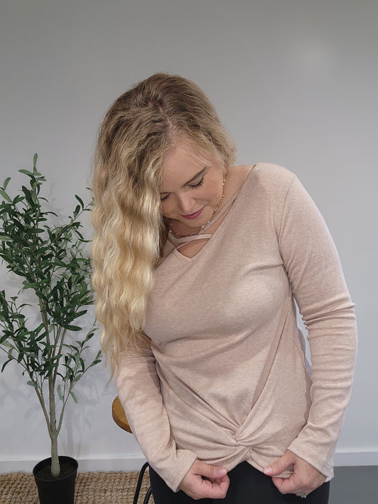 Khaki Criss Cross V-Neck Long Sleeve Top