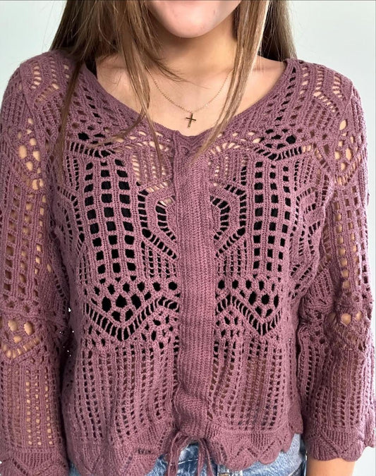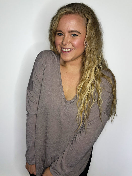 Mocha Double V-neck, Drop Shoulder Long Sleeve Top with Back Strap