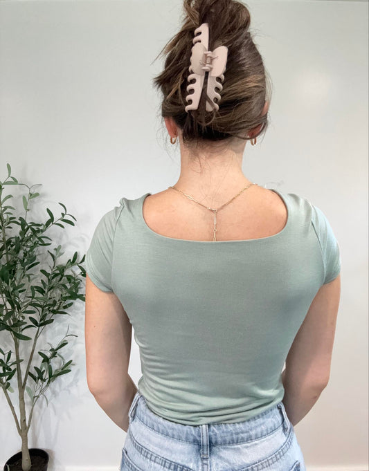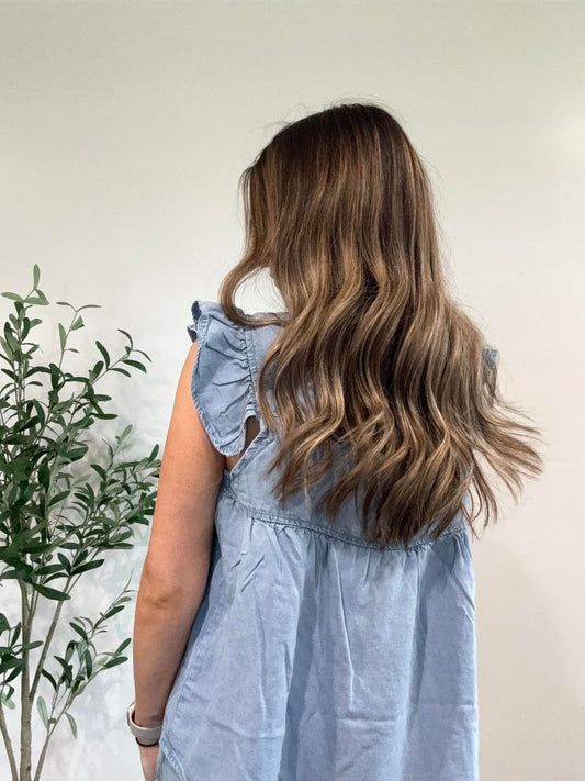 Denim Tencel Square Neck Ruffle Cap Sleeve Top