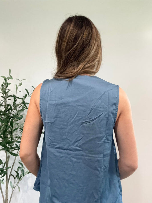 Dusty Blue Sleeveless Drape Shoulder Satin Blouse